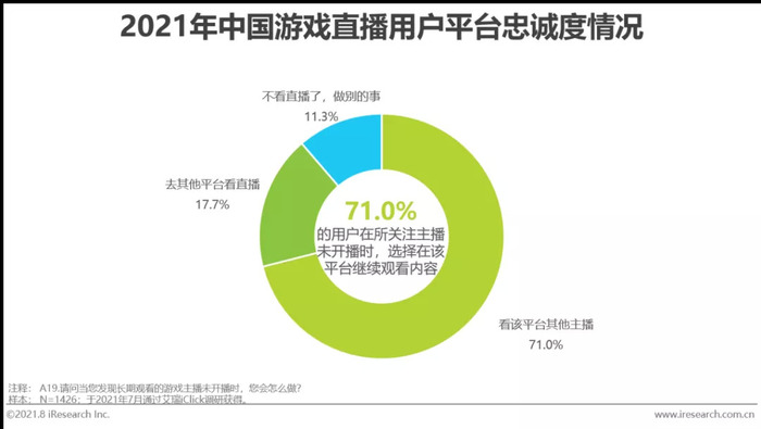 对于游戏直播平台而言,游戏主播资源是用户流量的长期保障,游戏直播用户关注主播的时长数据也说明了这一点:81.6%的游戏直播用户,关注最久的游戏主播时长达到了一年以上,关注时长在两年以上的占比也达到了47.0%。用户对于游戏主播的忠诚度,也强化了用户对平台的忠诚度:71.0%的用户在其长期关注主播未开播时,仍会在原平台观看其他直播内容。