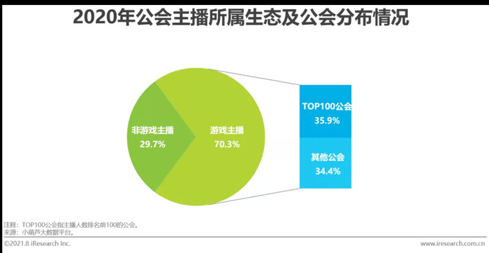 根据小葫芦大数据平台监测数据显示,2020年加入公会的主播总数约83.3万人,其中游戏主播58.6万人,占比70.4%,跟2019年相比,公会游戏主播增长12.7万人,同比增长27.6%,而非游戏主播数量的同比增长率为22.8%,游戏主播仍是各大公会重点培养和发展的对象。可以看到,TOP100公会是公会游戏主播的主要来源,超过一半的公会游戏主播出自大型直播公会。游戏主播作为电竞产业链中重要的内容生产者,开始参与到各种形式的电竞内容生产之中,这也促使更多相关企业投入和发展主播经纪业务。