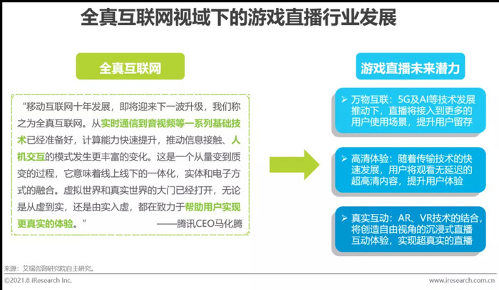2020年底,“全真互联网”的概念被提出,描绘了一个万物可互联、互动超真实的互联网世界,随着科技的创新和新兴技术的持续发展,这一设想正在一步步的实现。全真互联网对于游戏直播而言,一方面,用户将在更多元的流量入口、更丰富的使用场景中,接入到直播之中;另一方面,用户将在沉浸式的直播观看中,得到更高清、更真实、更优质的体验。