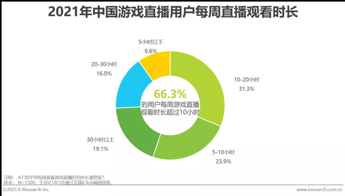 从游戏直播用户的观看频次看,71.5%的用户每天都会观看游戏直播,其中每天看2-5次的用户占比最高,达到35.4%;从游戏直播用户的观看时长看,66.3%的用户每周观看游戏直播超过110小时,其中每周看10-20小时的用户占比最高,达到31.3%。