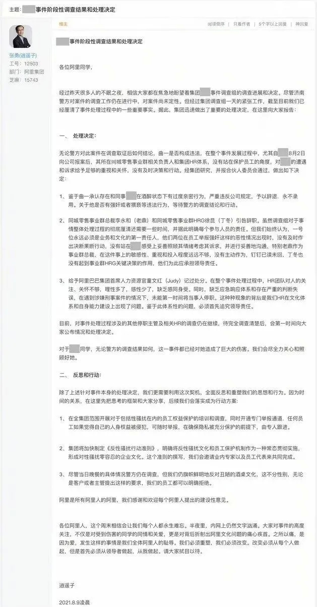 从7月27日事发到内部层层传导,再到维权和引爆舆论,11天时间,“阿里女员工被侵害”事件无疑将这一互联网大厂推至风暴中心。直至8月8日凌晨,阿里巴巴董事局主席兼CEO张勇在内网发帖,对上述事件做出回应,表示出“震惊、气愤、羞愧”。更提出:该道歉的不仅是HR团队,相关各级业务主管都有责任,都应该为冷漠、为没有及时处理而道歉;8月9日,张勇在阿里内网公布了上述事件的阶段性内部调查结果和处理决定,并表态了阿里巴巴在后续的反思和行动。