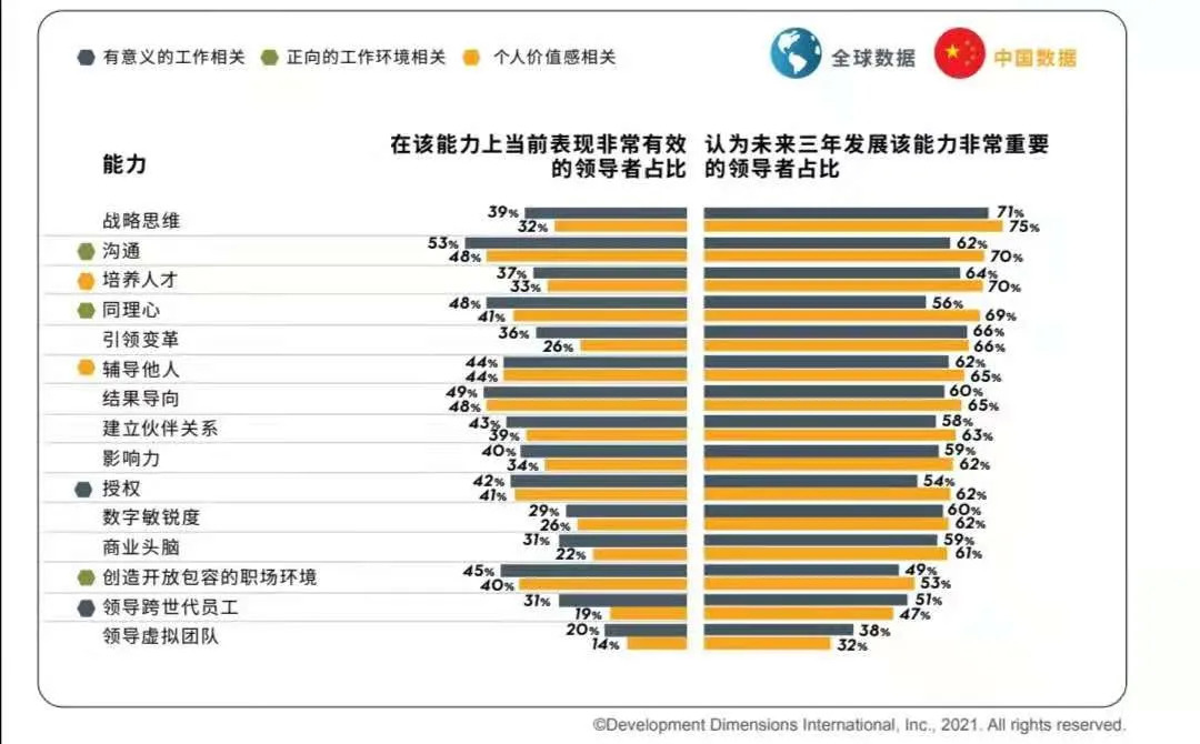 与此同时,调研中也显示领导者们在选择未来三年需进一步发展的关键技能中,除排名第一的是战略思维(中国75% vs. 全球71%),第二是沟通(中国70% vs. 全球62%),第三是同理心(中国69% vs. 全球56%)。因此,这也为企业及HR 指引了一个能力提升的明确方向。