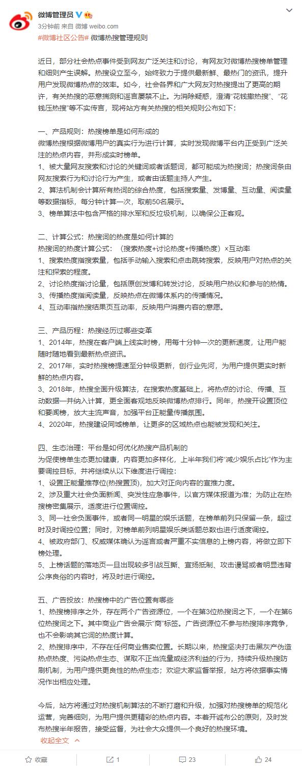 8月23日上午,微博管理员发布公告公布微博热搜管理规则,澄清“花钱撤热搜”、“花钱压热搜”等不实传言。