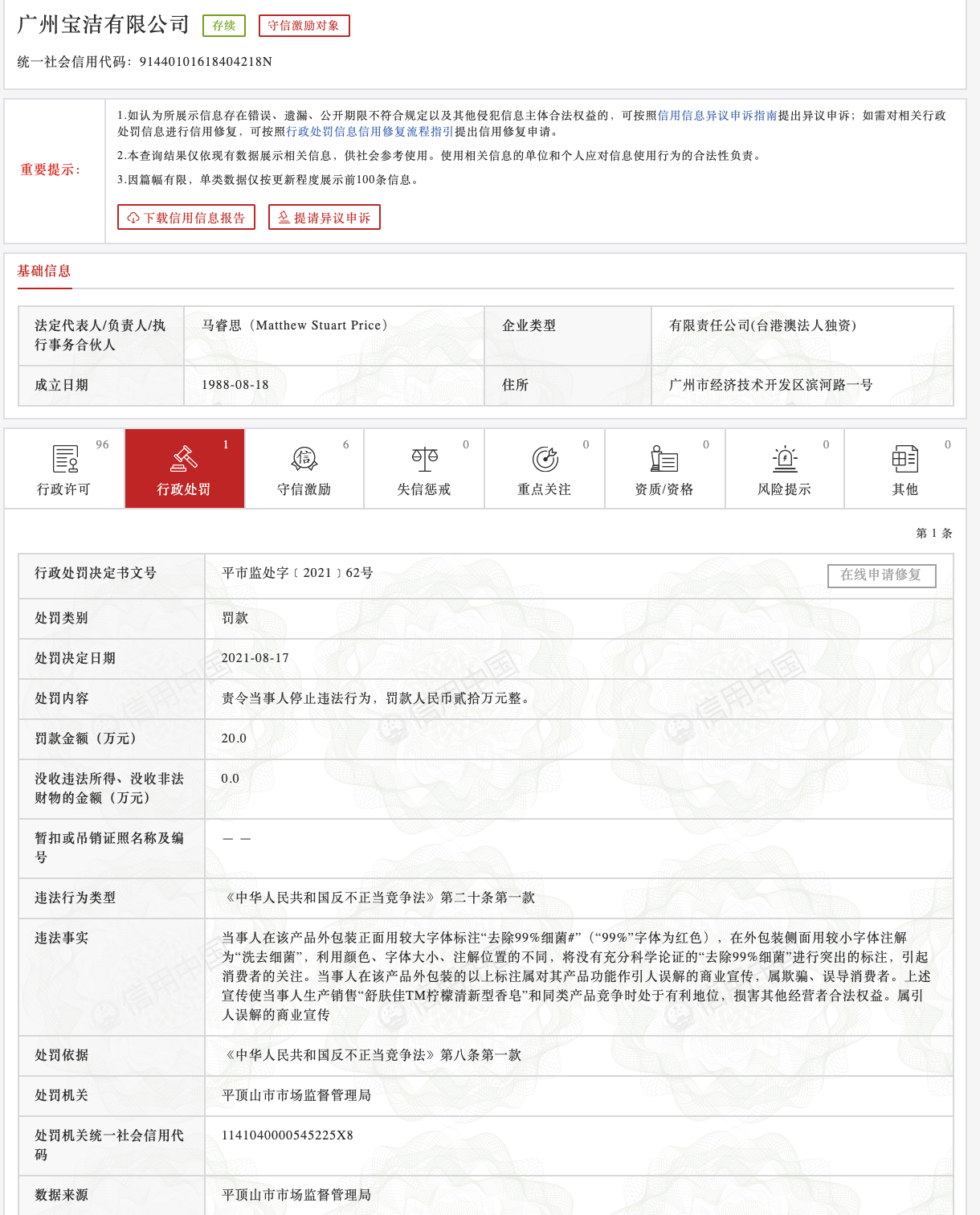 信用中国网站显示,8月17日,广州宝洁有限公司新增一条行政处罚,处罚事由为当事人在产品外包装上将没有充分科学论证的“去除99%细菌”进行突出的标注,对其产品功能作引人误解的商业宣传,使当事人生产销售“舒肤佳TM柠檬清新型香皂”和同类产品竞争时处于有利地位,损害其他经营者合法权益。最终处罚结果为罚款20万人民币,并责令停止违法行为。处罚单位为平顶山市市场监督管理局。