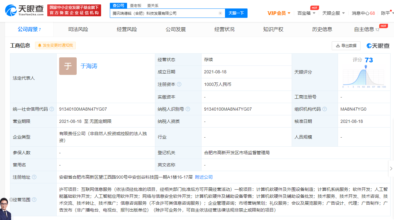 据天眼查APP显示,8月18日,腾讯瑞德铭(合肥)科技发展有限公司成立,法定代表人为于海涛,注册资本1000万人民币,经营范围包括互联网信息服务;计算机系统服务;人工智能应用软件开发;网络与信息安全软件开发等。股东信息显示,该公司由重庆腾讯信息技术有限公司100%控股。