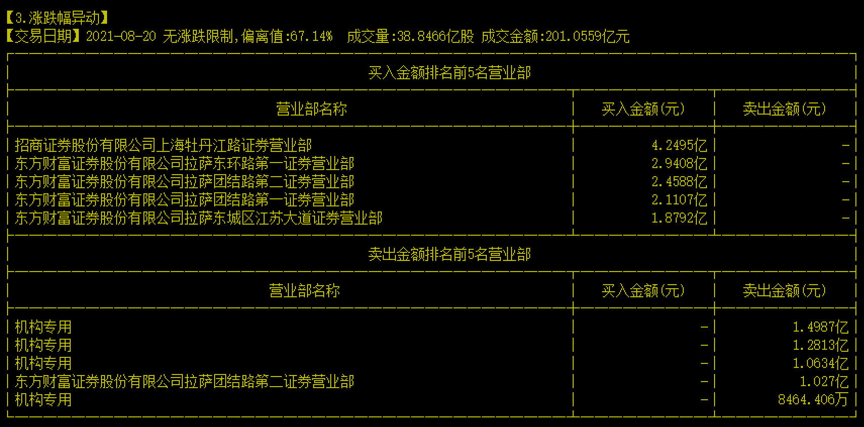 8月20日,中国电信换手率巨大,当日成交额201.1亿元,其中的多头主力有招商证券上海牡丹江路营业部,买入金额4.2495亿元,东方财富拉萨东环路第一营业部、东方财富拉萨团结路第二营业部、东方财富拉萨团结第一营业部、东方财富拉萨东城区江苏大道营业部等,也有携手上榜,买入金额分别达2.9408亿元、2.4588亿元、2.1107亿元、1.8792亿元。只不知这些资金是否能成功出笼。