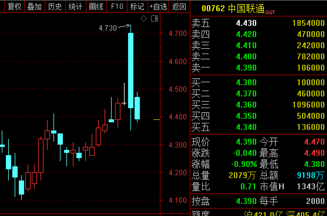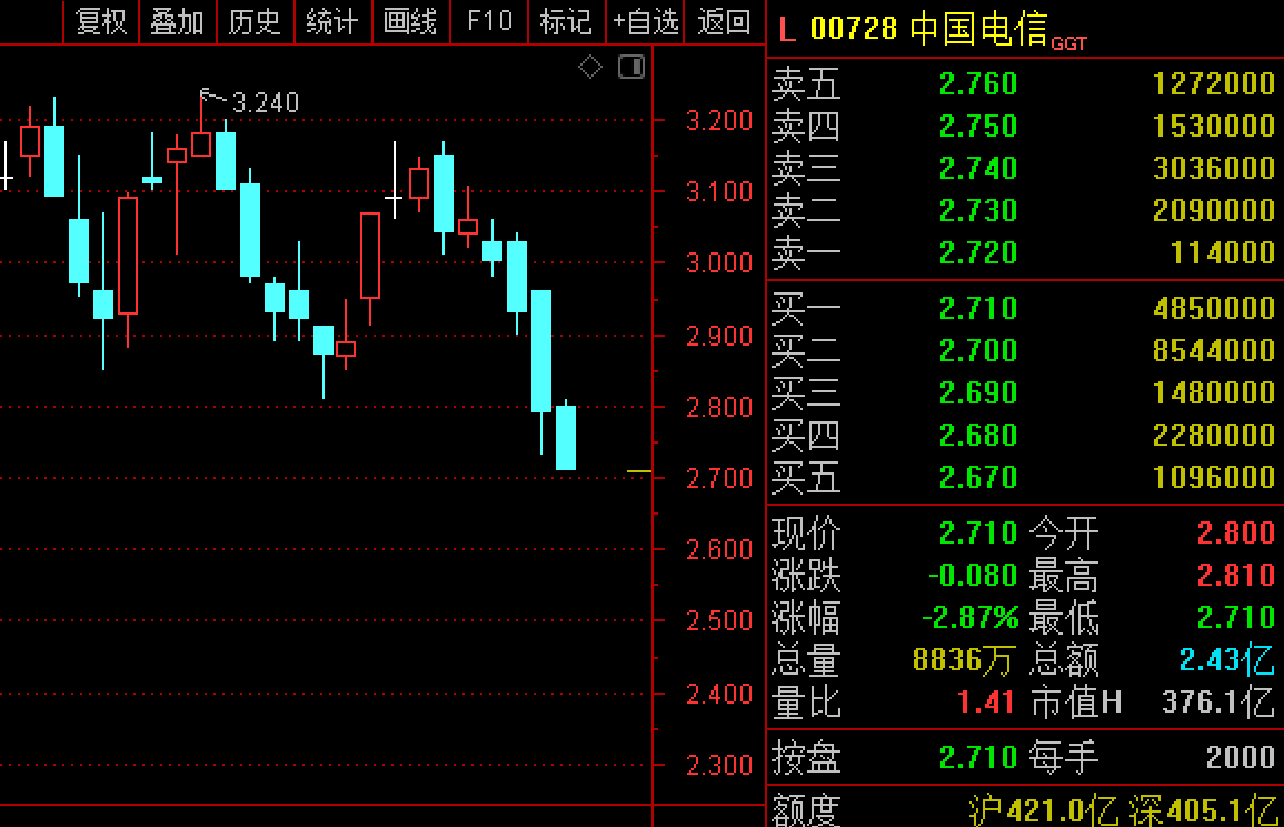港股方面,中国电信(00728.HK)已连续四天下跌,累计跌幅超10%。中国联通(00762.HK)的走势则较A股方面有所滞后,8月20日以5.62%的涨幅开盘,但高开低走当天便跌回原形,8月23日继续势弱,截至当日午盘跌1.35%。