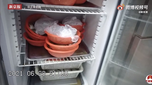 北京东四环的胖哥俩肉蟹煲合生汇店,是一家合营店。《新京报》记者在该店发现,每天一早,供货商会送来活蟹,交由后厨宰杀后售卖。由于客流不稳定,每天总有杀好的螃蟹卖不完,少则十来只,多则近百只。卖剩下的螃蟹,后厨通常放在冰箱里冷藏。第二天,清洗后,再充当现杀的活蟹卖给顾客,而顾客大多被蒙在鼓里。