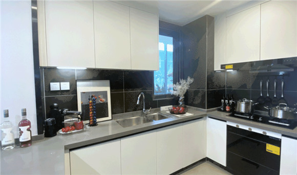 在推拉门打开的时候,定制中厨台可瞬间变为西厨岛台,佐餐备餐,围坐聊天,“传统”的中厨无缝切换为开放式的家庭社交中心。同时引入智能家电丰富了空间的层次变化,也重新定义了新生活态度人群对厨房的传统认知。