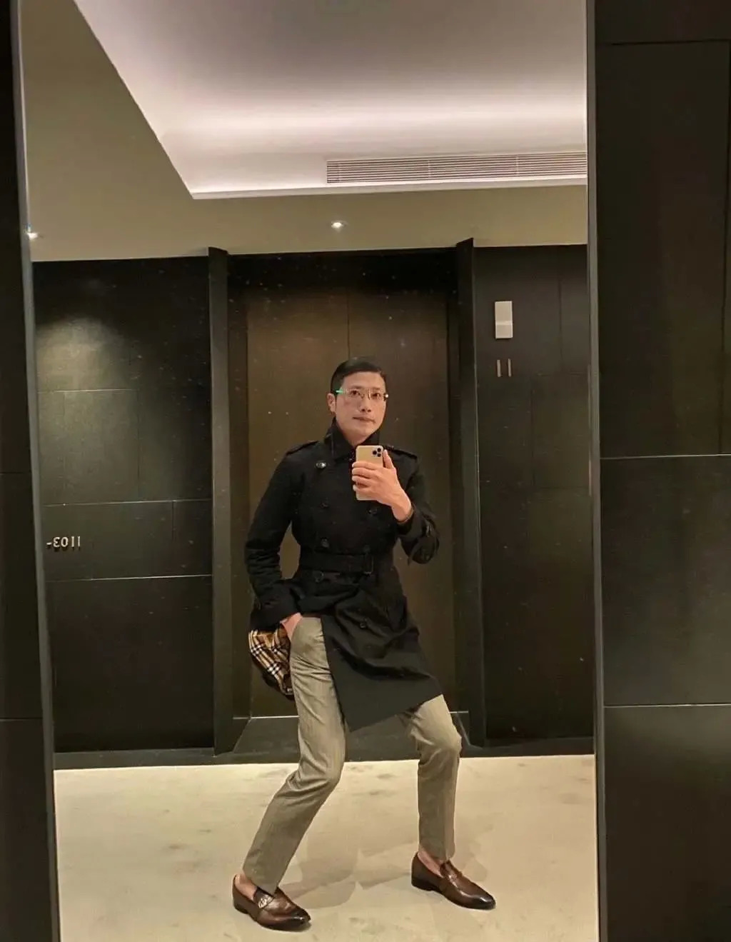 网友们又发现,徐勤根早在今年3月,就在微博发布了两张身穿风衣和皮鞋、梳着贴皮油头、微微侧身半蹲的对镜自拍,还设置成了背景和头像。这个怪诞搞笑的pose和他的求偶视频,继续被剪辑成短视频片段,搬运到抖音、快手,疯狂传播开来。