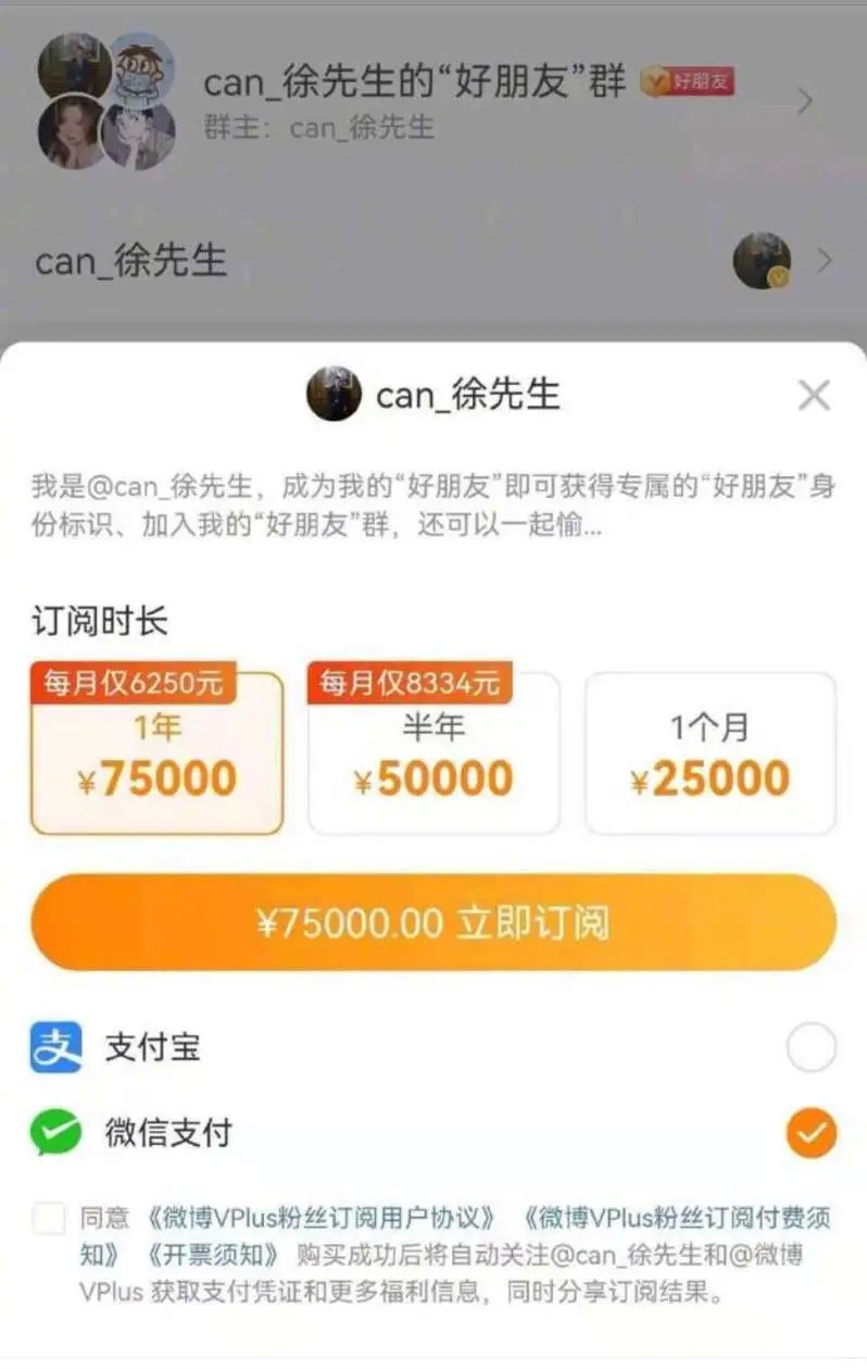 网友截图显示,用户想进入账号@can_徐先生的“好朋友”群,一年需支付7.5万元,半年订阅费为5万元,单月订阅费则为2.5万元。