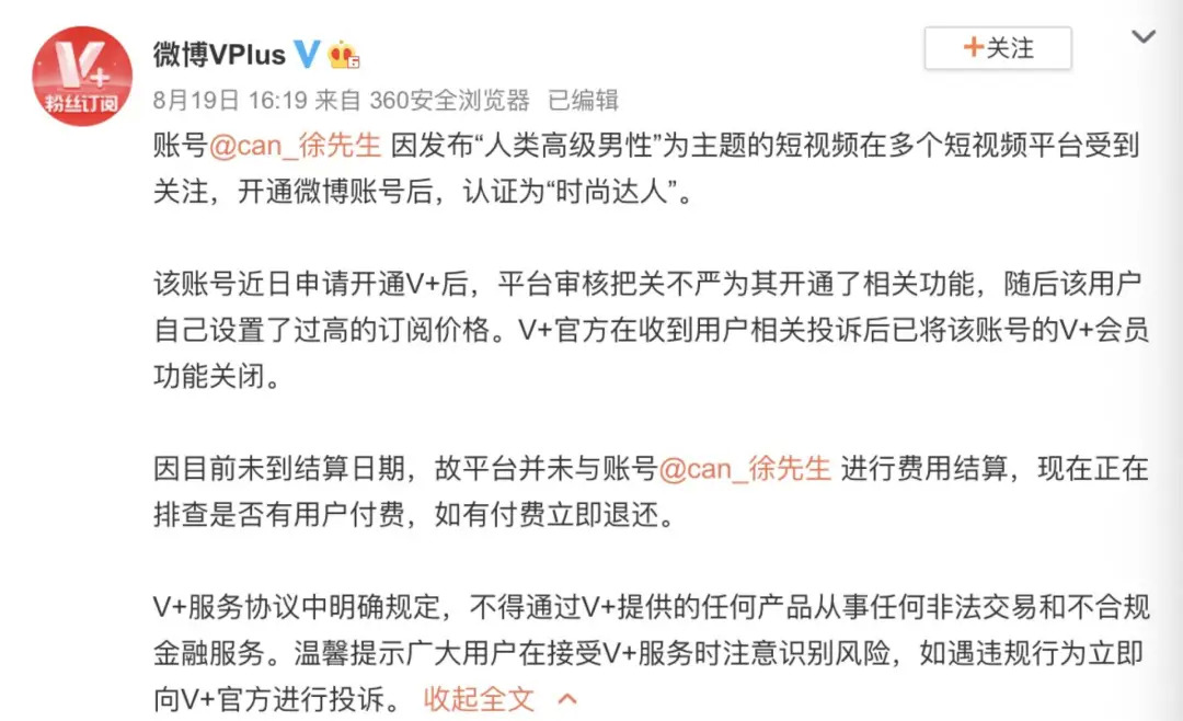 此前,8月19日下午,微博VPlus官方账号发布声明称,账号@can_徐先生 申请开通V+后,设置了过高的订阅价格,V+官方在收到用户相关投诉后已关闭其相关功能。