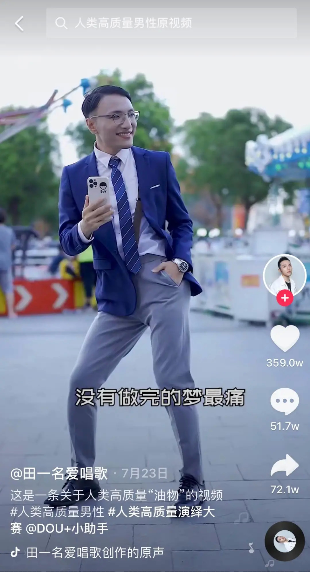 这则带着#人类高质量男性#tag的视频,颠覆了田一名此前“虽唱得油腻但长得阳光”的形象,彻底“油”出了新高度,又因与“人类高质量男性”的反差被疯狂吐槽,一条视频获得了359万点赞。