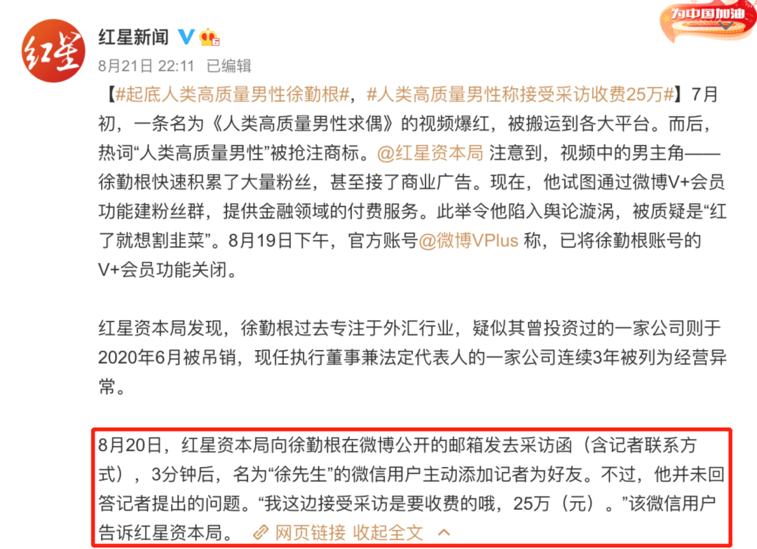 据红星新闻报道,徐勤根回应记者称“接受采访要收费,25万” 来源 / 微博截图