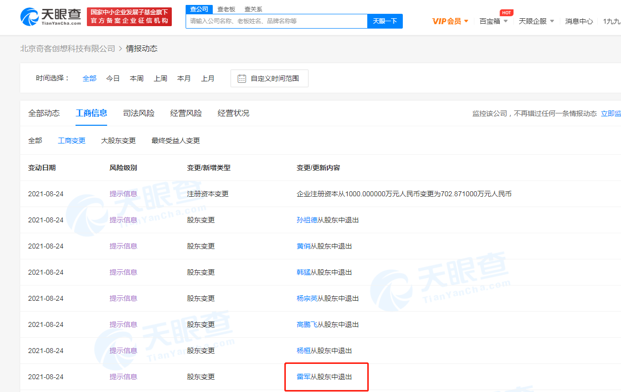 据天眼查APP显示,近日,7k7k游戏关联公司北京奇客创想科技有限公司发生工商变更,原股东雷军等退出,同时注册资本从1000万减至约703万。