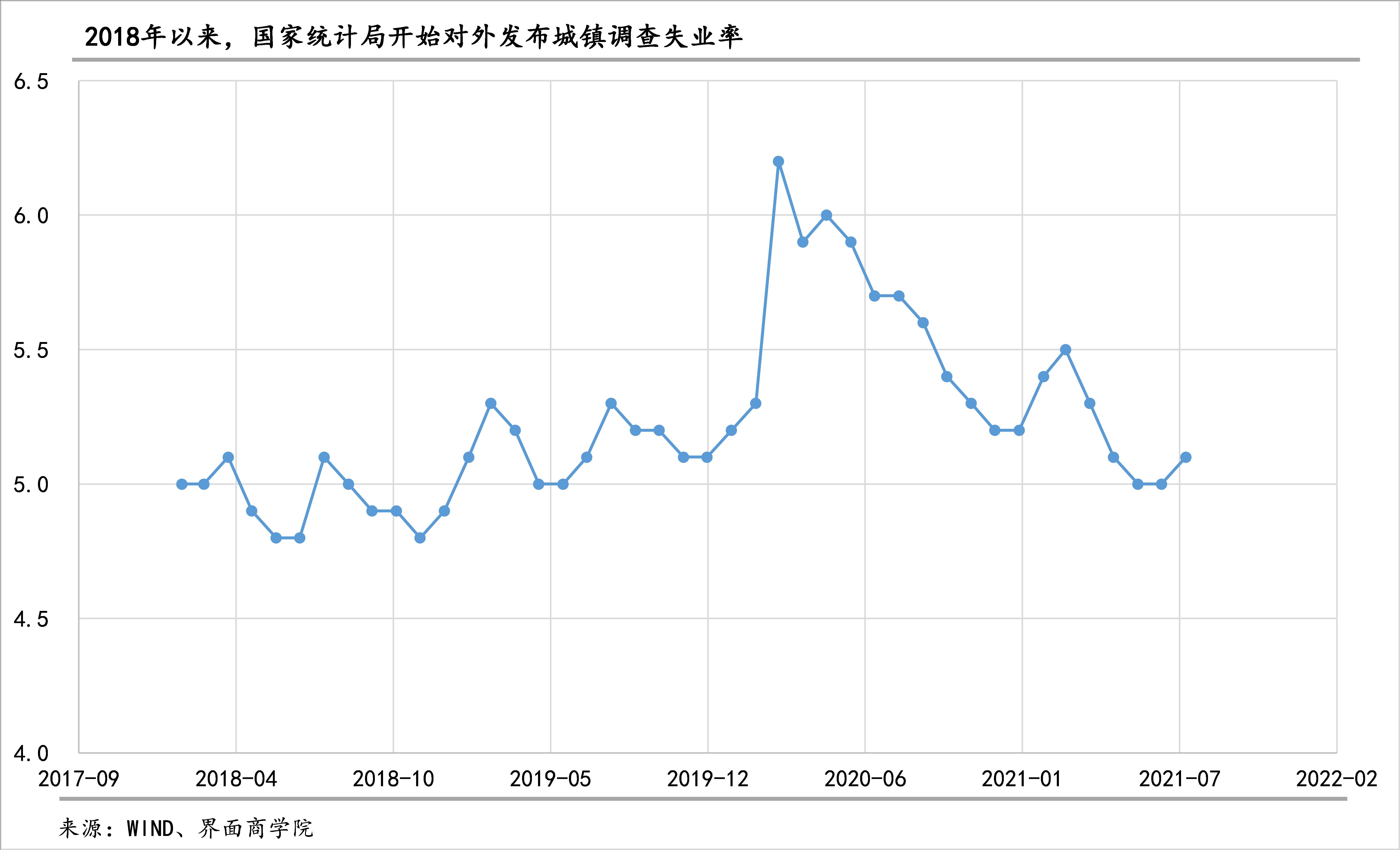 近期,国家统计局发布的7月份城镇调查失业率为5.1%,较6月份上升了0.1个百分点。去年疫情冲击最严重的时候,失业率上升至6.2%(2020年2月份)。该指标自2018年发布以来,最小值为4.8%、最大值为6.2%,中位数为5.1%,四分之三分位数为5.3%,平均值为5.23%。