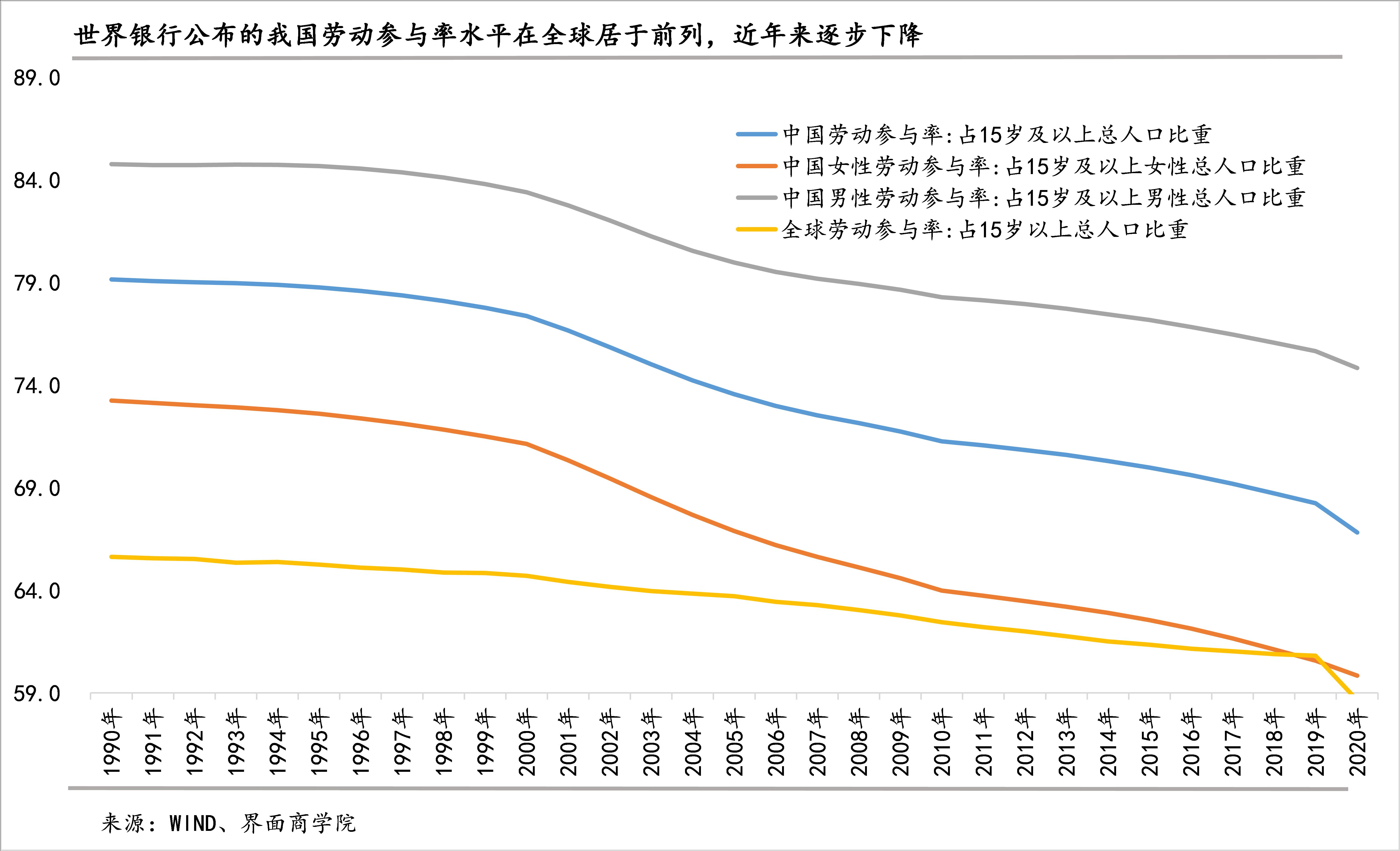 与就业人数关系紧密的劳动参与率的实际情况也可能与此前的认知有所不同。劳动参与率是经济活动人口(就业人口+失业人口)在潜在劳动力人口中的比率。国家统计局目前并没有对外公布劳动参与率,世界银行公布了占15岁及以上总人口比重的劳动参与率,其中,我国劳动参与率居全球前列,近年来逐步下降,到2020年为66.82%。