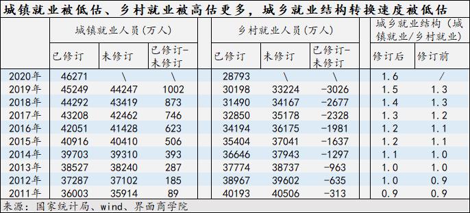 城乡就业人员比重由此调整,仍然以2019年为例,修订前城镇就业人口是乡村就业人口的1.3倍,修订后上升为1.5倍。