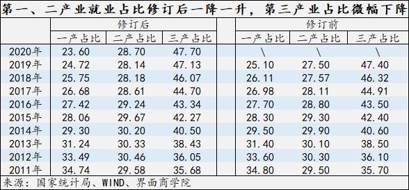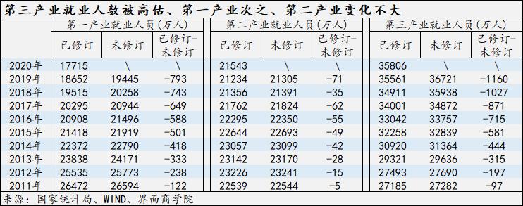 尽管全国就业人口在“七普”后向下修订逾2000万,但是,从就业结构来看,各板块修订的方向和幅度都有比较大的差别。