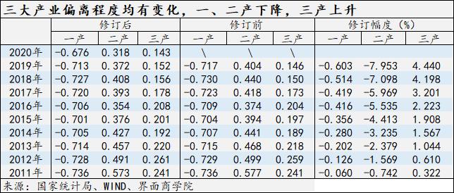不过,各大产业结构偏离度在修订后仍有变化。修订后,第一和第二产业结构偏离程度变小,第三产业结构偏离程度变大;与修订前相比,第一产业结构偏离度变化幅度最小,第二产业变化幅度最大,第三产业次之。以2019年为例,第二产业的结构偏离度下降了7.95个百分点;第一产业的结构偏离度微幅收窄0.6个百分点;第三产业偏离度则扩大了4.44个百分点。