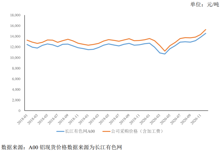 招股书显示,铝型棒材的采购价格主要包括铝型棒材自身价格和加工费。由于公司与供应商在一定期间内对加工费的定价较为稳定,故采购价格主要受铝型棒材价格的影响,公司铝型棒材采购单价(含加工费)的变动趋势与长江有色市场A00铝现货平均价格(不含税)变动较为一致,具体如下: