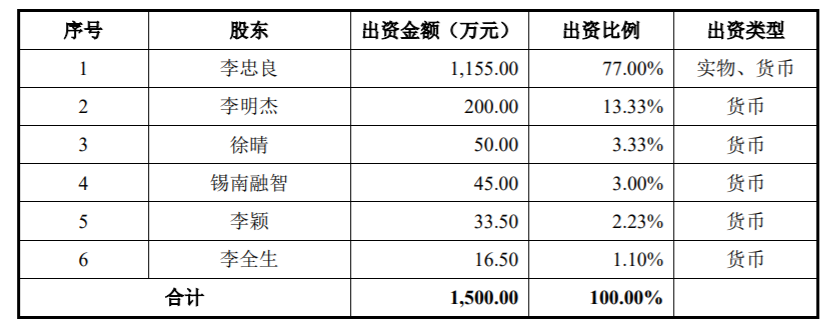 随即2019年12月1日,锡南有限(公司前身)召开股东会,李忠良(控股股东)将其所持有的公司1.10%的股权(对应16.50万元出资额)转让给李全生,2.23%的股权(对应 33.50万元出资额)转让给李颖,3.33%的股权(对应50万元出资额)转让给徐晴,13.33%的股权(对应200万元出资额)转让给李明杰,3.00% 的股权(对应45万元出资额)转让给锡南融智,转让之后股权结构如下: