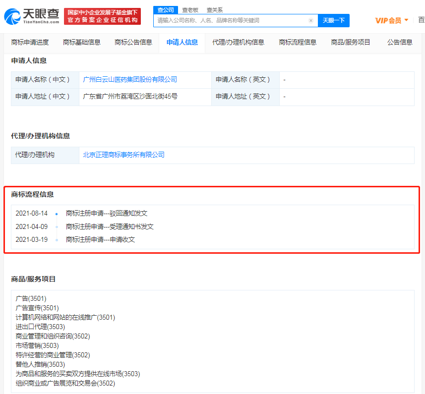 据天眼查APP显示,近日,广州白云山医药集团股份有限公司申请的多个“高寿”商标流程状态变更为驳回通知发文,商标国际分类涉厨房洁具、广告销售等。