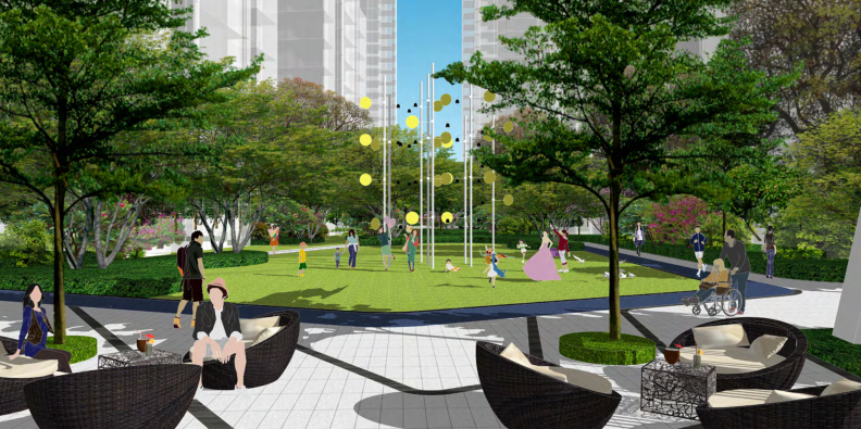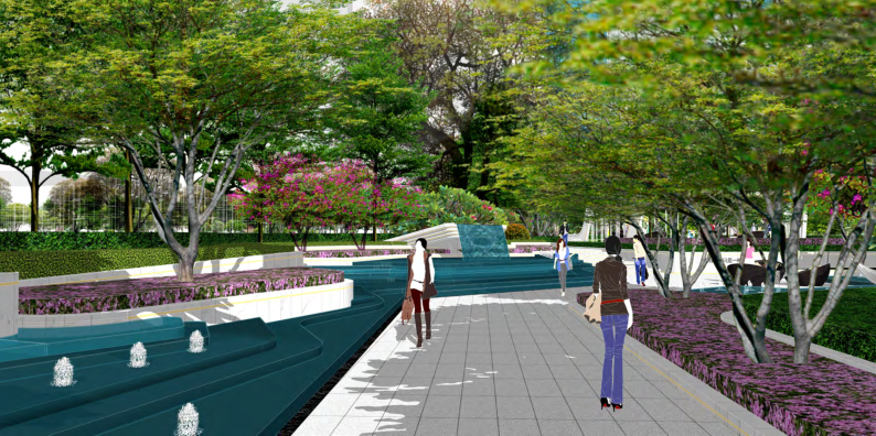 园林景观以遂宁市市花—荷花作为设计理念切入点,由自然生长的“荷”,联系到 “几何” 空间,通过玩转“几何”空间将“荷”文化融入设计。园区的廊架、绿化、灯饰、铺装等都以荷花的元素进行设计,打造“出淤泥不染,濯清涟不妖”的自然园林文化。