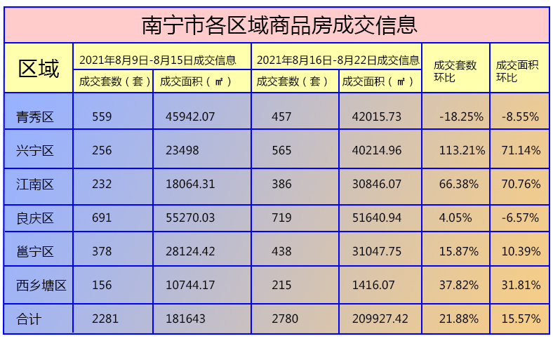 据南宁市住房保障和城乡建设局网站监测数据显示,上周(2021年8月16日-8月22日)南宁市商品房成交2780套,成交面积共计20.99万㎡,较前一周成交套数环比上涨21.88%,成交面积环比上涨15.57%。截至2021年8月22日,南宁市商品住宅可售存量为89601套,可售面积为985.08万㎡。