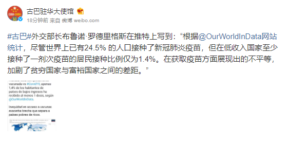 @古巴驻华大使馆 微博 8月24日发布消息,古巴外交部长布鲁诺·罗德里格斯在推特上写到:“根据@OurWorldInData网站统计,尽管世界上已有24.5%的人口接种了新冠疫苗,但在低收入国家至少接种了一剂次疫苗的居民接种比例仅为1.4%。在获取疫苗方面展现出的不平等,加剧了贫穷国家与富裕国家之间的差距。”