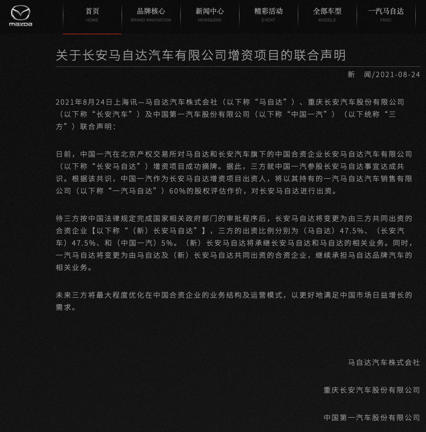 8月24日,马自达中国官网发布关于长安马自达汽车有限公司增资项目的联合声明。日前,中国一汽在北京产权交易所对马自达和长安汽车旗下的中国合资企业长安马自达汽车有限公司(下称长安马自达)增资项目成功摘牌。据此,三方就中国一汽参股长安马自达事宜达成共识。根据该共识,中国一汽作为长安马自达增资项目出资人,将以其持有的一汽马自达汽车销售有限公司(下称一汽马自达)60%的股权评估作价,对长安马自达进行出资。