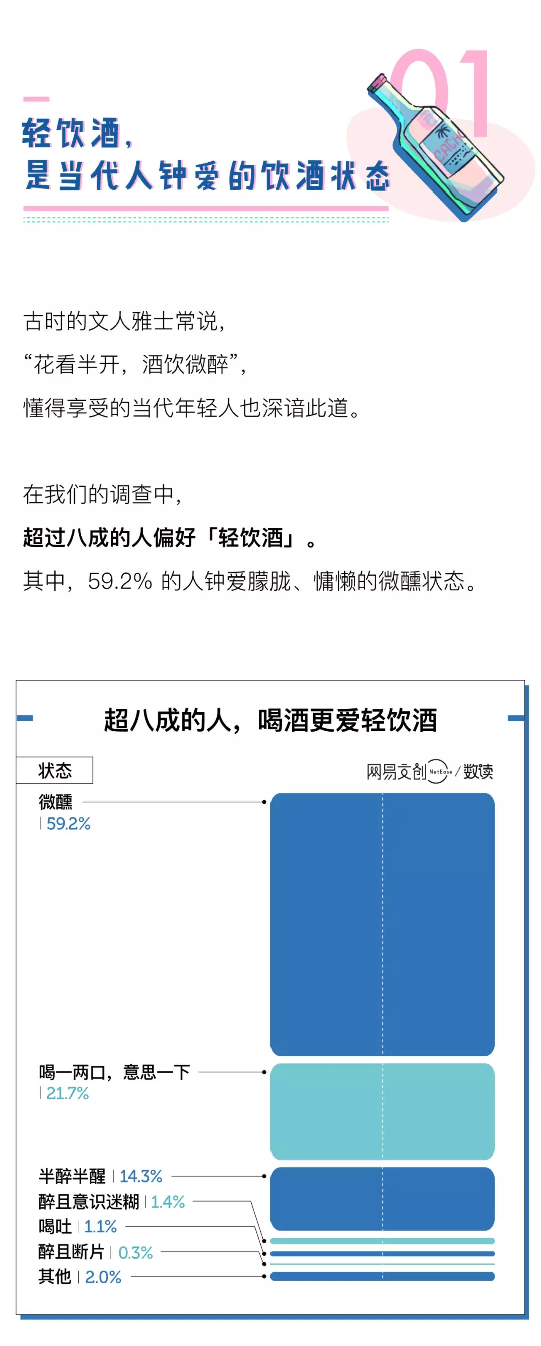 2020年4月底,网易数读发布的《当代年轻人轻饮酒调查报告》显示,轻饮酒是当代年轻人钟爱的饮酒方式,超过8成年轻人表示偏好这一状态,超过59%的人喜欢朦胧、慵懒的微醺状态。