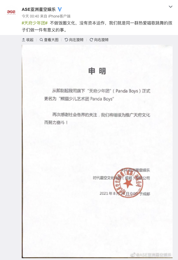 24日凌晨,天府少年团所属公司@ASE亚洲星空娱乐 发布声明,天府少年团正式改名为熊猫艺术少儿团,并表示不做饭圈文化,没有资本运作,并称从即刻起旗下“天府少年团”(Panda Boys)正式更名为“熊猫少儿艺术团Panda Boys”。