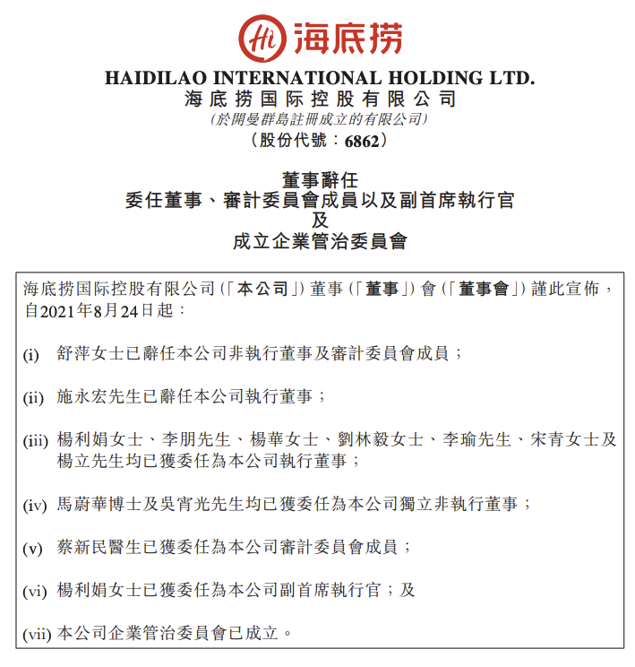 8月24日,海底捞在港交所发布公告称,自2021年8月24日起:舒萍女士已辞任本公司非执行董事及审计委员会成员;施永宏先生已辞任本公司执行董事;杨利娟女士、李朋先生、杨华女士、刘林毅女士、李瑜先生、宋青女士及杨立先生均已获委任为本公司执行董事;马蔚华博士及吴宵光先生均已获委任为本公司独立非执行董事;蔡新民医生已获委任为本公司审计委员会成员;杨利娟女士已获委任为本公司副首席执行官;及本公司企业管治委员会已成立。