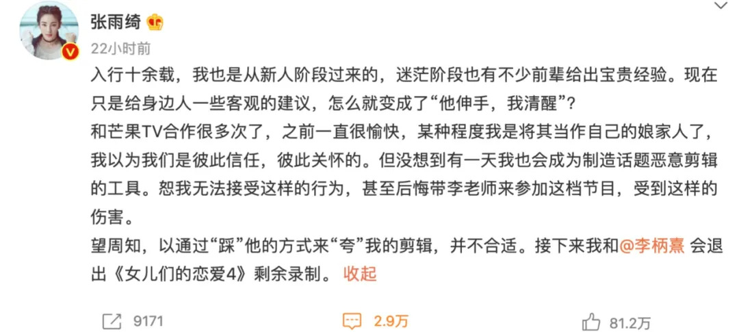 因不满“魔鬼剪辑”发博开呛的明星不要太多,但因一个下期预告就diss节目组并宣布退出录制的,张雨绮恐怕是第一个。