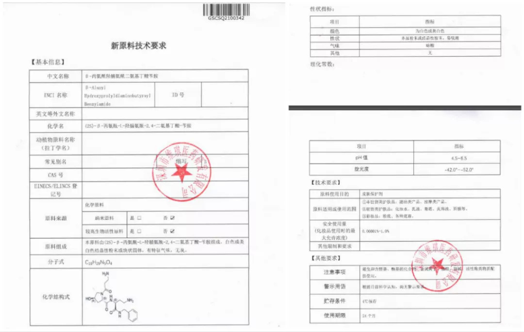 譬如,β-丙氨酰羟脯氨酰二氨基丁酸苄胺的“新原料技术要求”中显示,该原料的INCI名称为β-Alanyl Hydroxyprolydiaminobutyroyl Benzylamide,使用目的为皮肤保护剂,可用于非驻留类护肤品,如清洁类、按摩类产品;也可用于化妆水、乳液、膏霜、美容液、面膜等驻留类护肤品及粉底、各种底霜的彩妆品。据了解,该新原料在化妆品中使用时的最大允许浓度为0.00001%-1.0%。
