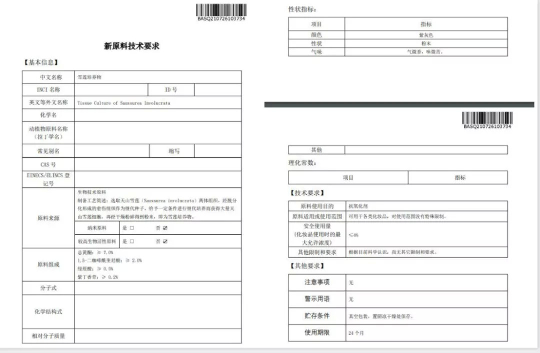 而雪莲培养物的英文等外文名称为Tissue Culture of Saussurea Involucrata,诸如INCI 名称、ID号等多处为空白项。据了解,该原料系生物技术原料,由≥ 7.0%总黄酮、≥ 2.0%1,5-二咖啡酰奎尼酸、≥ 0.5% 绿原酸、≥ 0.2%紫丁香苷组成。