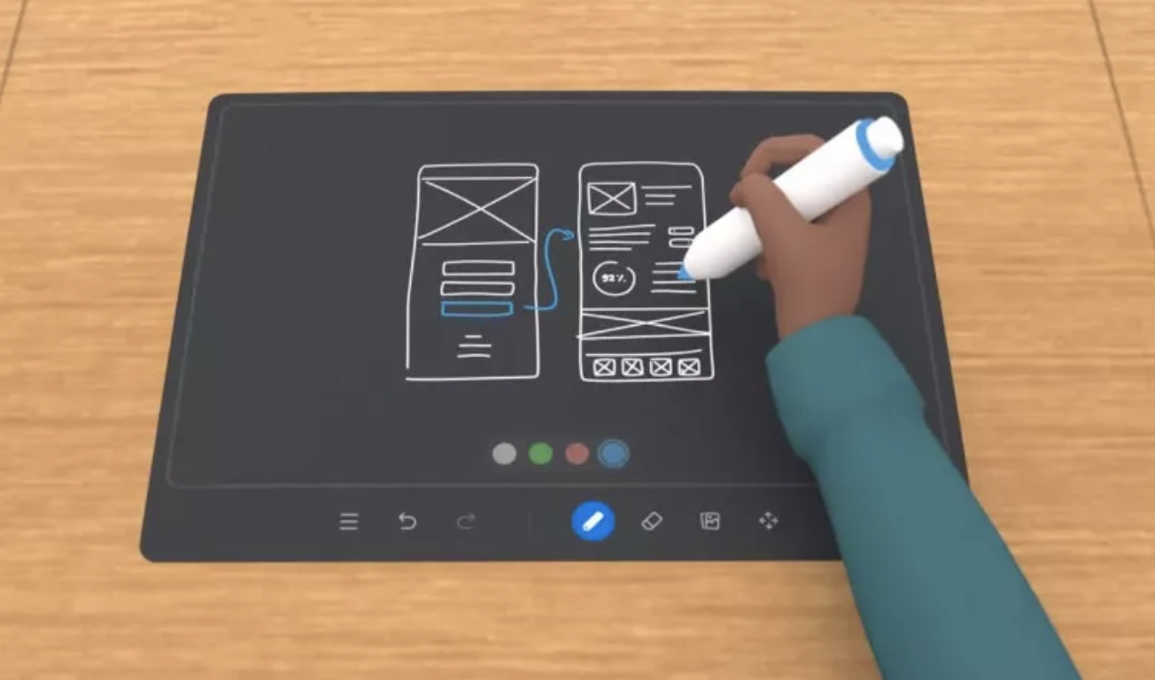 Facebook 认为白板是头脑风暴和协作的重要组成部分,让用户可以随时记录、分享想法,因此在Workroom里也嵌入了白板功能。用户可以直接站起来走到会议室的白板进行书写,也可以将办公桌用作迷你画。