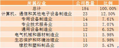 从行业角度来看,184家创业板注册制上市公司来自38个行业,其中有7个行业的公司数量超过10家。具体来看,计算机、通信和其他电子设备制造业为23家、专用设备制造业为14家、专业技术服务业为13家、通用设备制造业为12家、电气机械和器材制造业为11家、生态保护和环境治理业为11家、橡胶和塑料制品业为10家。