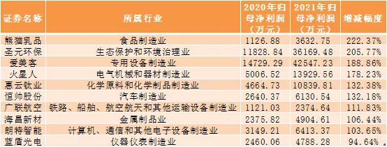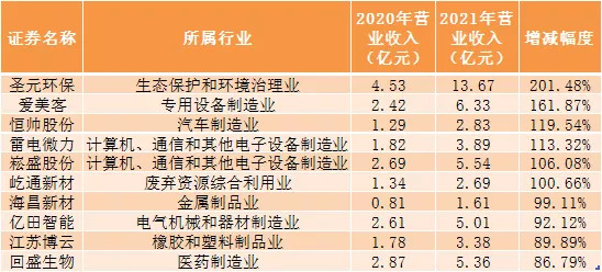 具体来看,营业收入方面,目前80家公布业绩的公司中有66家2021年营业收入同比增长,占比高达82.5%。其中,收入增幅前十的公司分别是201.48%的圣元环保、161.87%的爱美客、119.54%的恒帅股份、113.32%的雷电微力、106.08%的崧盛股份、100.66%的屹通新材、99.11%的海昌新材、92.12%的亿田智能、89.89%的江苏博云、86.79%的回盛生物。