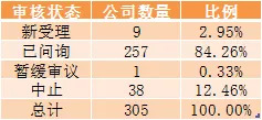 截至8月24日,深交所官网显示,共有305家公司等待创业板上会。从审核状态来看,处于新受理的有9家、已问询为257家、暂缓审议为1家、中止为38家,超8成公司处于已问询状态。