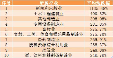 整体来看,184家公司中平均股价涨幅前十的行业分别是涨幅为1135.48%的新闻和出版业、400.32%的土木工程建筑业、398.08%的其他制造业、281.85%的专用设备制造业、275.77%的畜牧业、275.70%的文教、工美、体育和娱乐用品制造业、269.91%的医药制造业、258.37%的废弃资源综合利用业、248.88%的批发业、246.76%的酒、饮料和精制茶制造业。
