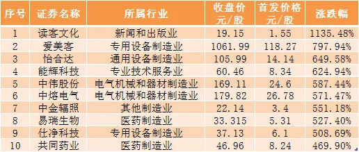 从涨跌情况来看,截至8月24日收盘,184家创业板注册制上市公司相较发行价的平均涨幅为164.82%。其中,涨幅前十名分别为涨幅为1135.48%的读客文化、797.94%的爱美客、649.58%的怡合达、624.94%的能辉科技、587.44%的中伟股份、571.47%的中熔电气、551.18%的中金辐照、527.40%的易瑞生物、508.69%的仕净科技、469.90%的共同药业。