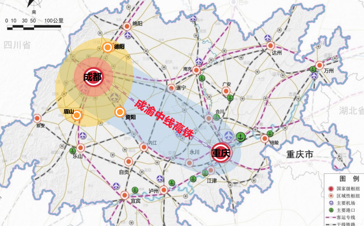 建设成渝中线高铁时,将同步改造重庆北站、成都站、成渝铁路、渝怀铁路、成都客机整备所,同时成都地区将新增一座大型高铁站。