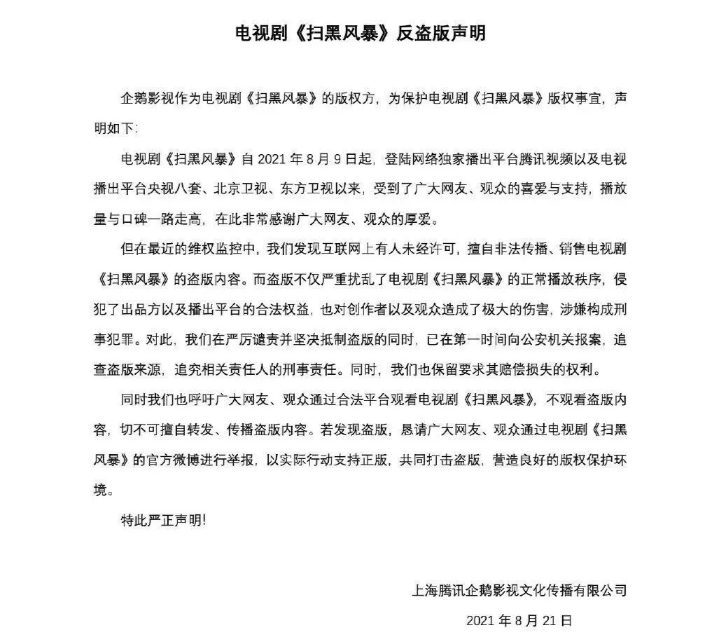 8月19日,《扫黑风暴》开启超前点播,随后网上释出剧集全集高清资源,盗版内容如病毒般在网络扩撒,提前网络大结局。虽然腾讯企鹅影视即时发布关于《扫黑风暴》反盗版声明,但是重大损失在所难免。