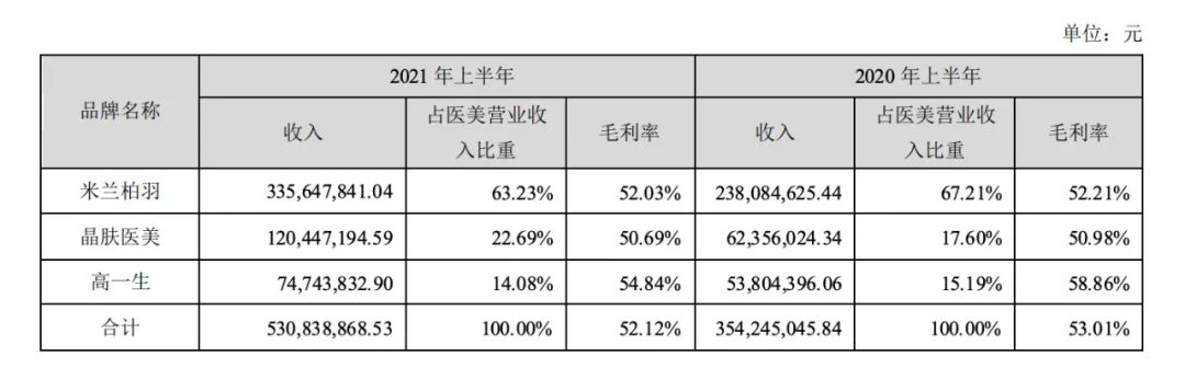 各品牌“吸金”情况如何?2021年上半年,“米兰柏羽”品牌贡献了最高的营收,达到3.36亿元,占医美业务总营收的63.23%,但营收占比相对2020年同期有所下降。其次是“晶肤医美”品牌,带来1.2亿元营收,占医美营收的22.69%,占比逐年增大。最后是“高一生”品牌,带来0.75亿元营收,占医美营收的14.08%,占比逐年降低。