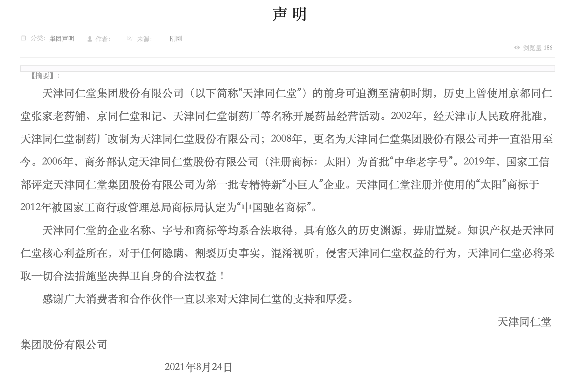 8月25日,天津同仁堂集团股份有限公司就知识产权问题发布声明称,公司前身可追溯至清朝时期,历史上曾使用京都同仁堂张家老药铺、京同仁堂和记、天津同仁堂制药厂等名称开展药品经营活动。天津同仁堂的企业名称、字号和商标等均系合法取得,具有悠久的历史渊源,毋庸置疑。知识产权是天津同仁堂核心利益所在,对于任何隐瞒、割裂历史事实,混淆视听,侵害天津同仁堂权益的行为,天津同仁堂必将采取一切合法措施坚决捍卫自身的合法权益。