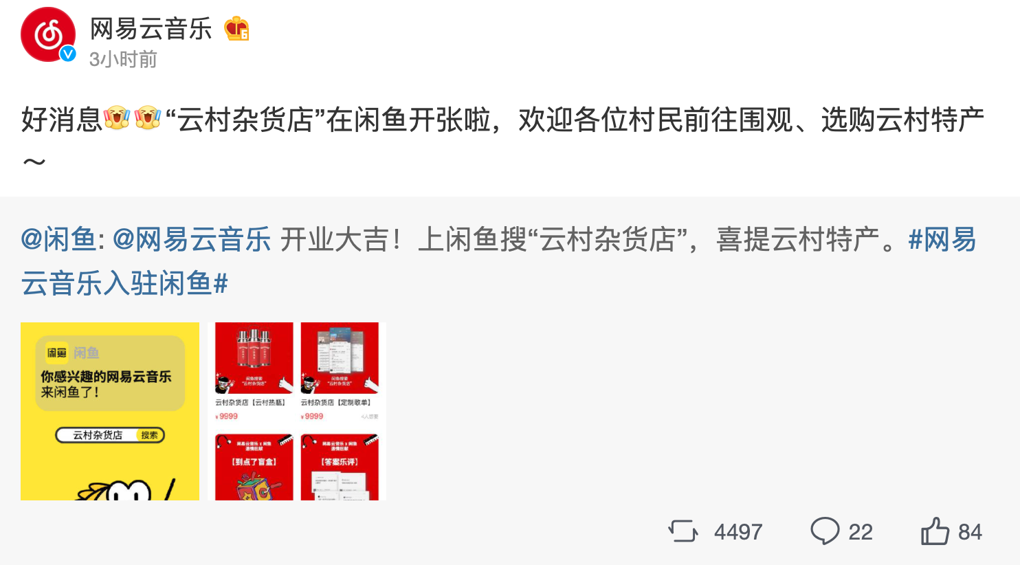 8月25日,@网易云音乐 转发@闲鱼 微博,官宣入驻闲鱼。据悉,在闲鱼搜“云村杂货店”即可购买相关产品。
