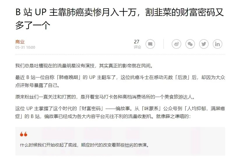 B站有个卖惨区,2019年12月,某位声称自己身患肺癌的UP主第一条视频的播放量就高达67.7万,弹幕将近9000条,打赏硬币11.9万。知名苦情“男主”林生斌入驻抖音一年零三个月以来,粉丝200多万。过去半年内,林生斌的抖音账号共直播14场,累计销售额达1497.7万。