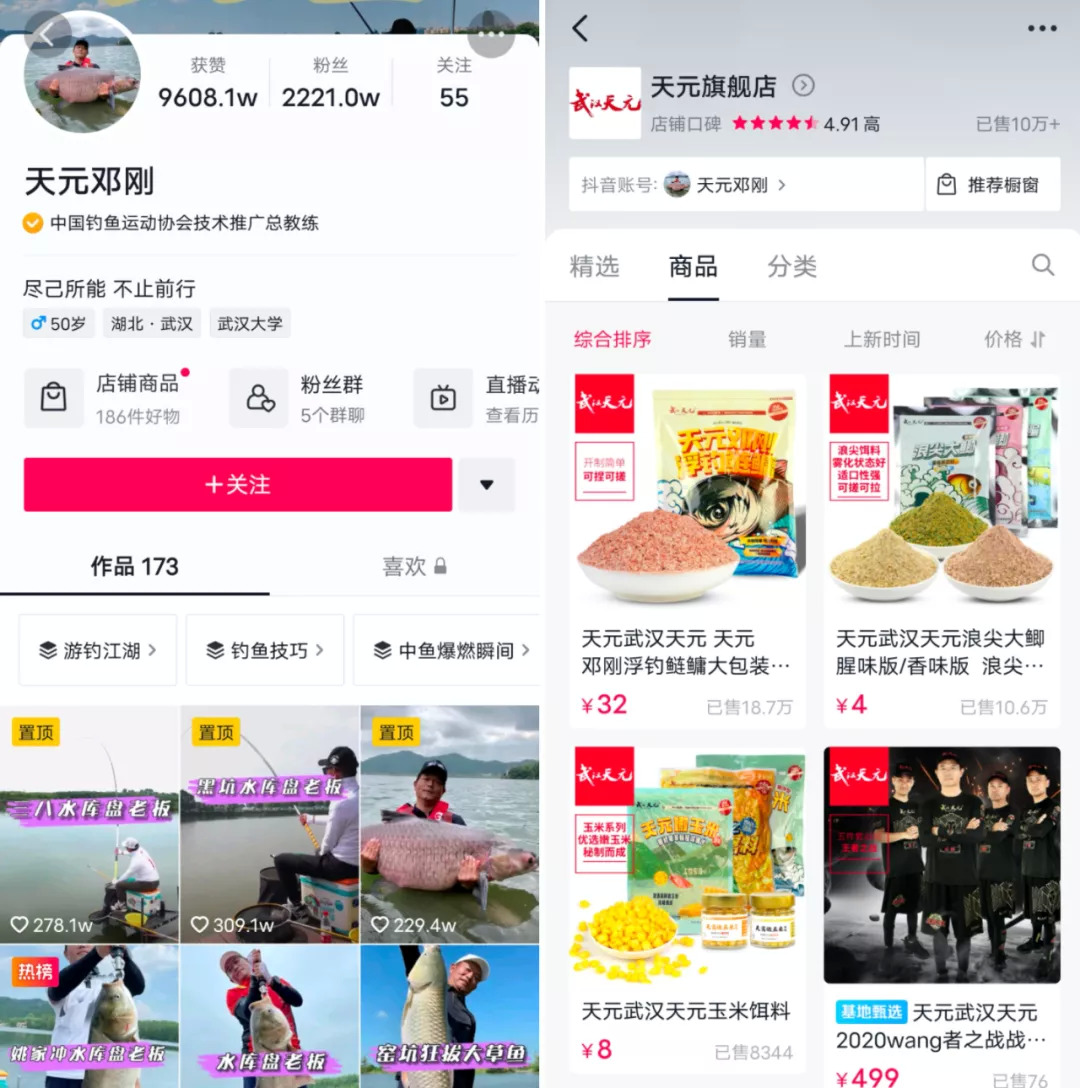 这也意味着,一批钓鱼达人在短视频平台的崛起。比如中国钓鱼运动协会技术推广总教练邓刚,抖音账号:天元邓刚,从2019年10月的第一条视频至今,不到两年的时间已坐拥两千万粉丝。